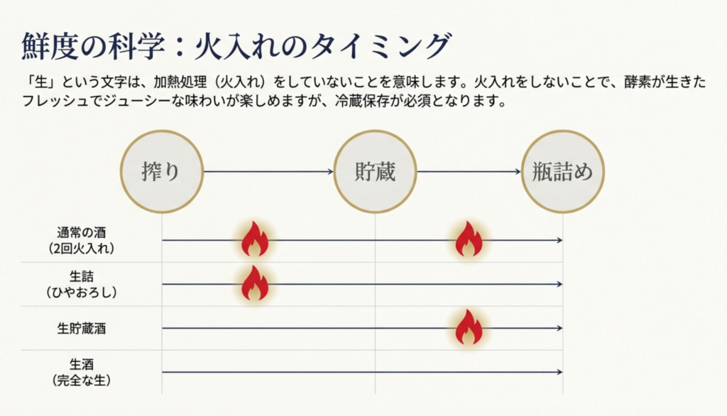通常の日本酒は、品質を安定させるために貯蔵前と出荷前の2回、「火入れ」と呼ばれる加熱処理を行います。この火入れの回数やタイミングによって、味わいは大きく変わります。