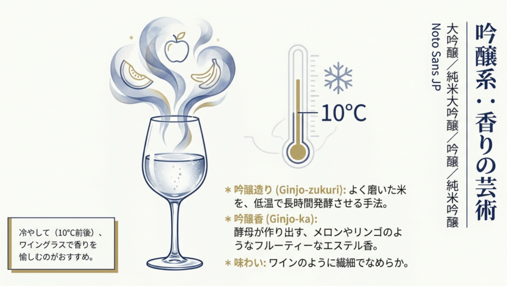 ◦ 特徴: 50%以下まで贅沢に磨き上げた米で造られる、アルコール添加系の最高峰。雑味のない極めてクリアな味わいと、花や果実を思わせる華やかで芳醇な「吟醸香」が最大の特徴です。繊細で上品な味わいは、日本酒に慣れていない方にもおすすめです。