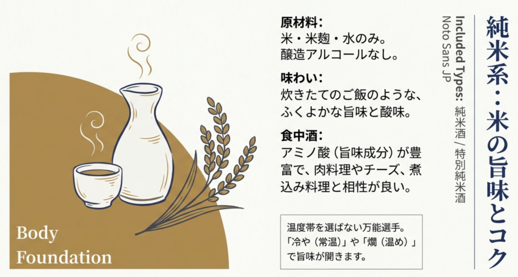 米、米麹、水のみで造られ、米本来の旨味やコクを深く味わえるグループです。